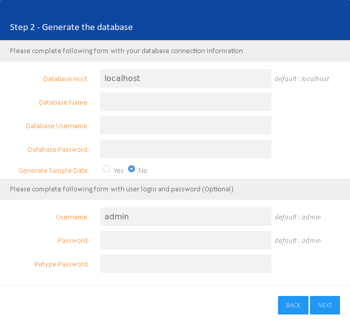 Langkah berikutnya, membuat pangkalan data dengan mengisi nama pangkalan data, pengguna pangkalan data, sandi lewat akses pangkalan data. Pilih "Yes" pada "Generate Sample Data" apabila Anda ingin menyertakan data contoh pada instalasi SLiMS Anda.