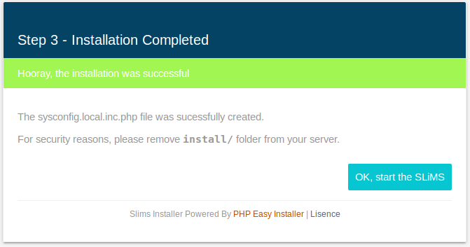 Demi keamanan hapus atau ubah nama direktori install yang terdapat di dalam direktori SLiMS: