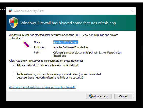 Pada MS-Windows yang Firewall-nya aktif, biasanya akan muncul pop-up “Windows Security Alert.” Klik tombol “Unblock” atau "Allow Access" untuk mengijinkan komputer menjalankan proses Apache web server. Seperti gambar di bawah: