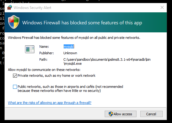 Berikutnya aktifkan mysql database server dengan klik dua kali pada berkas mariadb_start.bat. Pada MS-Windows yang Firewall-nya aktif, biasanya akan muncul pop-up “Windows Security Alert”. Klik tombol “Unblock” atau "Allow Access" untuk mengijinkan komputer menjalankan proses Mysql database server. Seperti gambar di bawah: