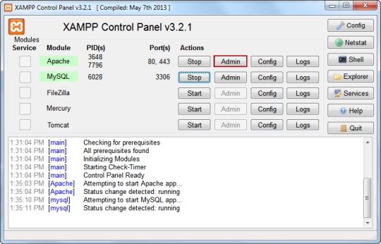 Jika proses MySQL berhasil diaktifkan, biarkan jendela tersebut. Berikut adalah tampilan ketika Apache dan MariaDB sudah aktif.