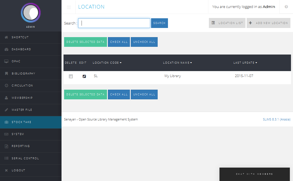 Sub-menu ini diisikan kode lokasi dan nama lokasi penempatan koleksi. Sub-menu ini bermanfaat untuk perpustakaan yang memiliki beberapa ruangan atau gedung perpustakaan yang terpisah.