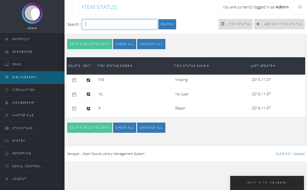 Sub-menu ini diisikan dengan status eksemplar (Repair, On Loan, Reserved). Pada Item Status ini diisikan: