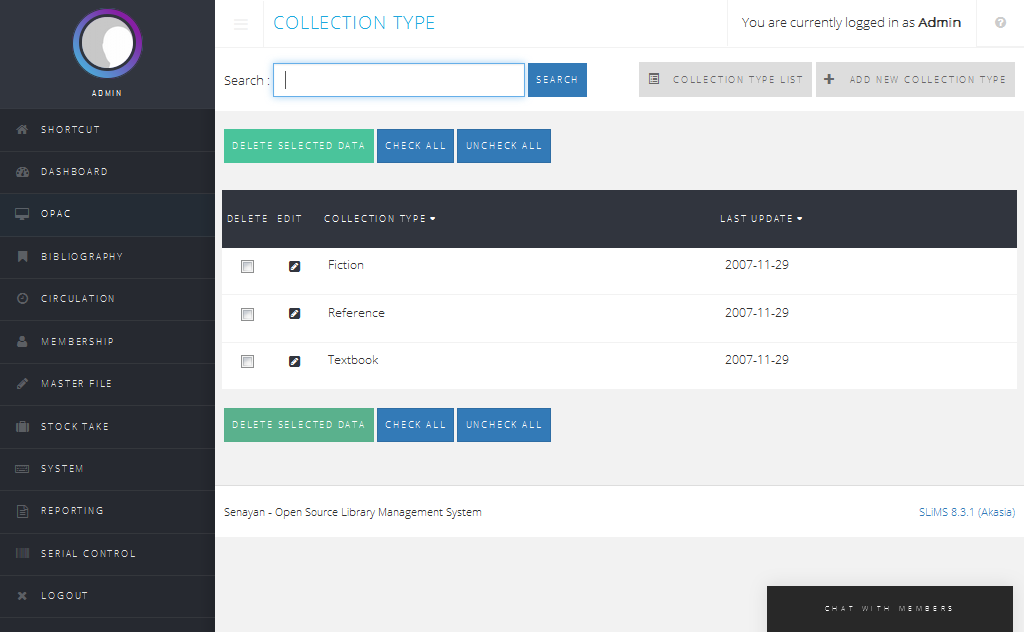 Sub-menu ini diisikan dengan tipe koleksi yang dimiliki perpustakaan, misal: Textbook, Reference, Fiction. Sub-menu ini memiliki beberapa fitur seperti: