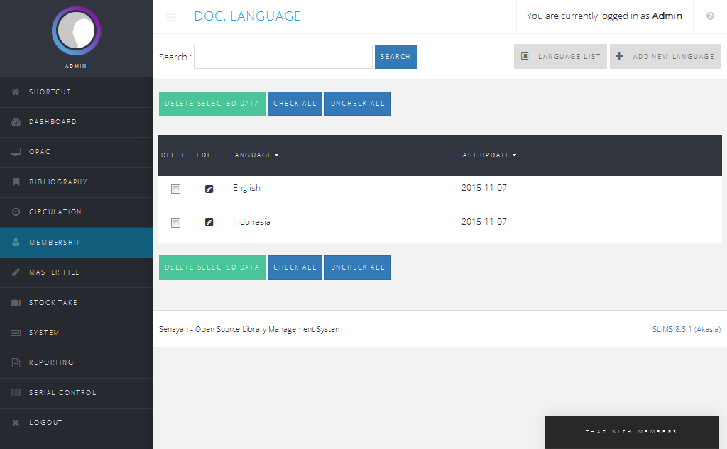 - Language List, untuk melihat daftar bahasa. Daftar bahasa ini dapat diurutkan berdasarkan Language dan Last Update;