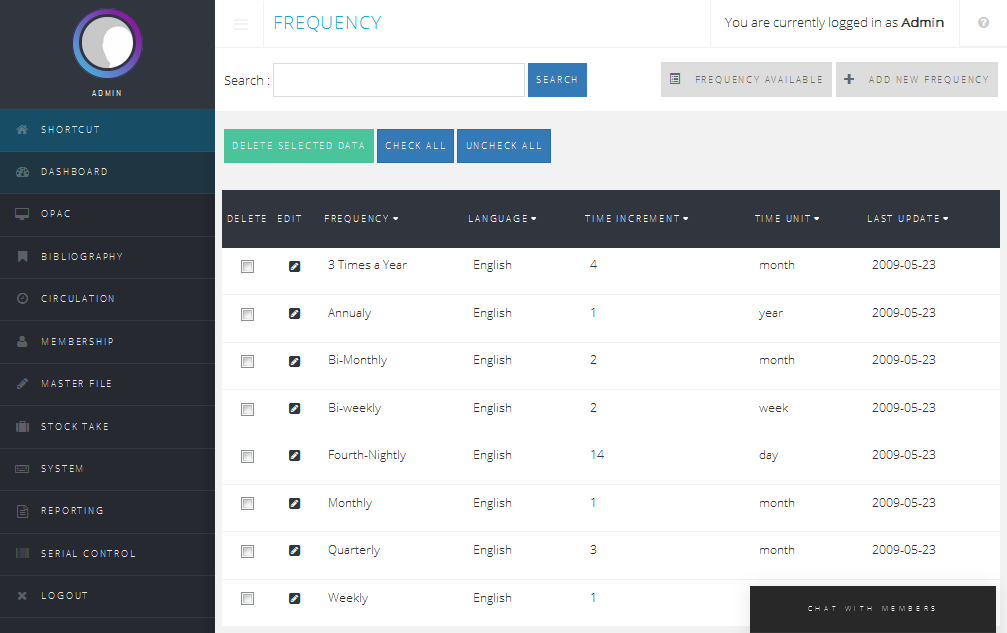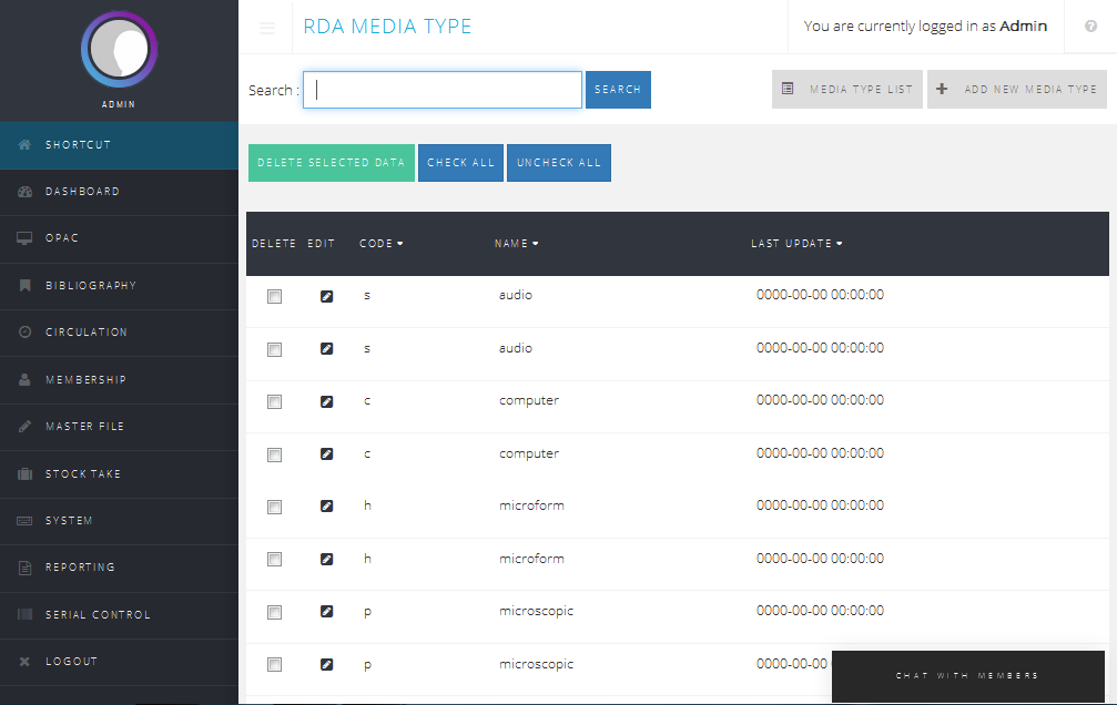 Sub-menu ini merupakan fitur yang dirancang untuk mengakomodasi standar pengatalogan yang baru yaitu Resource Description Access (RDA). Sub-menu ini diisikan dengan tipe media yang merujuk pada Resource Description Access (RDA). sub-menu ini memiliki fitur Media Type List, Add New Media Type, Edit, Delete.