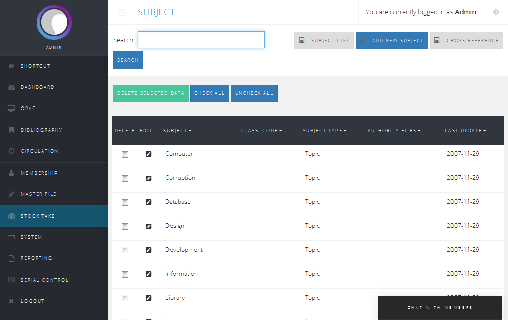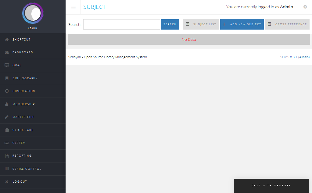 Sub-menu ini digunakan untuk menapis subyek yang ada dalam pangkalan data SLiMS, namun tidak digunakan. Ketika telah ditapis dengan cara klik Orphaned Subject, akan muncul daftar subyek yang tidak digunakan. Jika anda ingin menghapus, silakan pilih beberapa atau semua kemudian Delete.