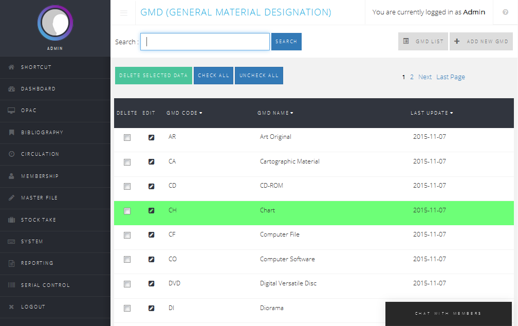 Bentuk fisik koleksi atau media fisik tempat penyimpanan informasi. Daftar dan tata cara penggunaan GMD merujuk atau dapat kita lihat pada Anglo American Cataloguing Rules (AACR). Kita dapat melihat daftar dari GMD yang ada dengan mengklik GMD List, Menambahkan GMD dengan mengklik Add New GMD, menghapus GMD dalam daftar, dan melakukan perubahan/sunting GMD dalam daftar.