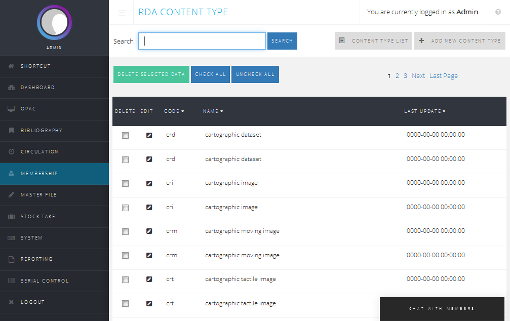 Menu ini merupakan fitur yang dirancang untuk mengakomodasi standar pengatalogan yang baru yaitu Resource Description Access (RDA). Menu ini diisikan dengan tipe isi yang merujuk pada Resource Description Access (RDA). Menu ini memiliki fitur Content Type List, Add New Content Type, Edit, Delete.