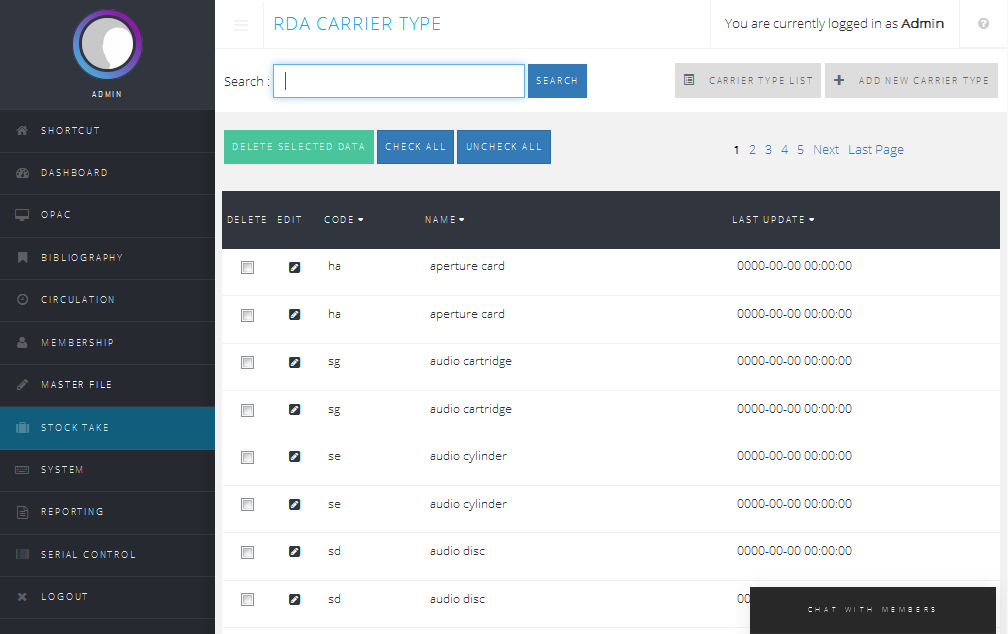 Sub-menu ini merupakan fitur yang dirancang untuk mengakomodasi standar pengatalogan yang baru yaitu Resource Description Access (RDA). Sub-menu ini diisikan dengan tipe pembawa yang merujuk pada Resource Description Access (RDA). Sub-menu ini memiliki fitur Carrier Type List, Add New Carrier Type, Edit, Delete.