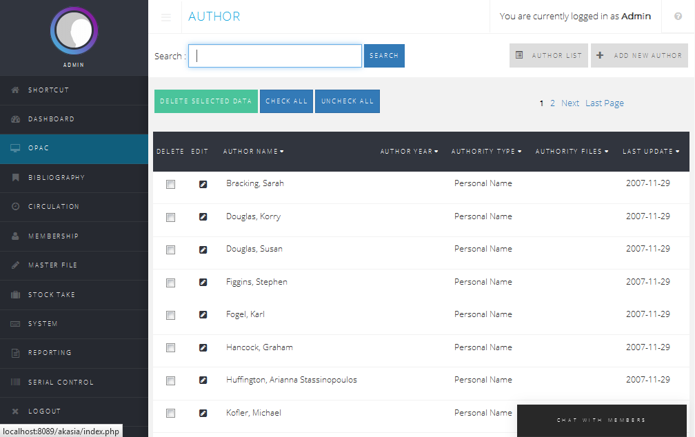 Sub-menu ini digunakan untuk menapis pengarang/author yang ada dalam pangkalan data SLiMS, namun tidak digunakan. Ketika telah ditapis dengan cara klik Orphaned Author, akan muncul daftar pengarang yang tidak digunakan. Jika anda ingin menghapus, silakan pilih beberapa atau semua kemudian Delete.