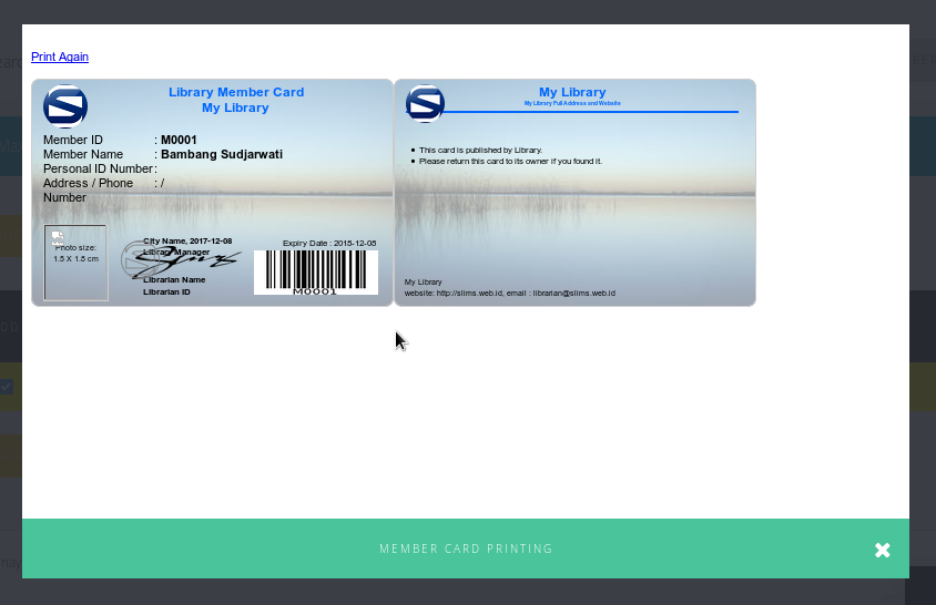 Menu ini digunakan untuk mencetak kartu anggota. Cara mencetaknya sama dengan cara mencetak label atau barcode. Informasi yang ada dalam kartu anggota ini adalah: