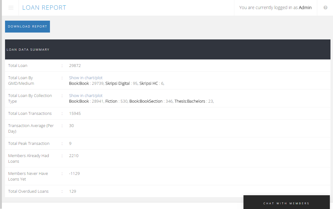 Mulai Senayan3-stable14, ketiga jenis laporan yang telah disebutkan tadi dilengkapi dengan fitur cetak grafik. Untuk mendapatkan Grafik ini cukup dengan klik pada tautan Show in Chart/Plot yang muncul pada ketiga jenis laporan ini (Collection Statistic, Loan Report, dan Membership Report).